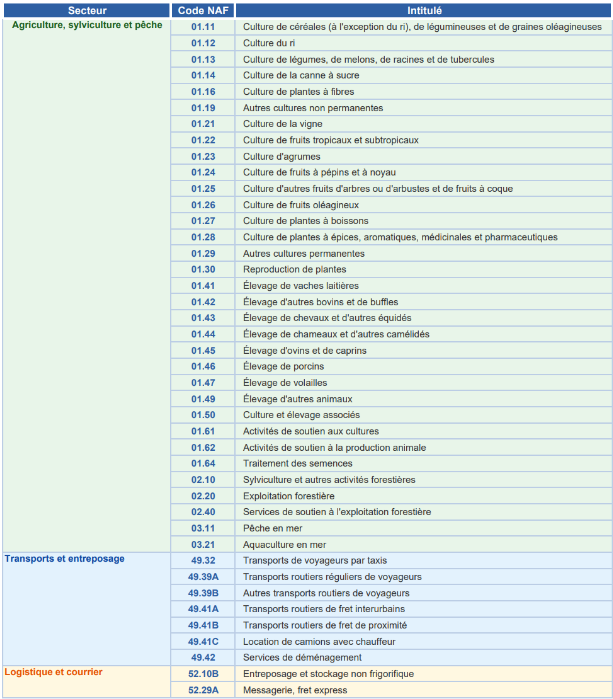 Liste des codes NAF éligibles